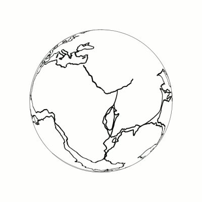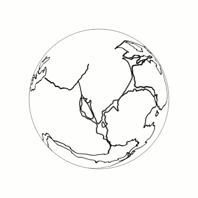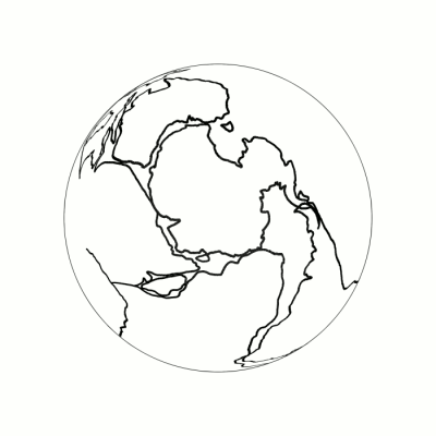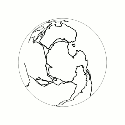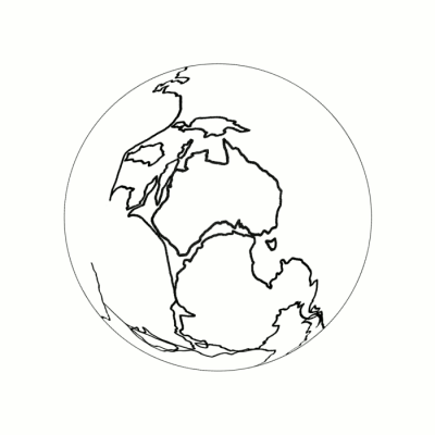 Above, on the right, is a map of the Earth showing Earth-Pangaea (the land area enclosed by the inner circle). The azimuthal equidistant projection has been used to create this map which is from the America Association of Petroleum Geologists, and is, reportedly, the most accurate available. For those who know this map, note that its creators trimmed (as uninteresting) a large area of ocean from it. I have extended the outermost ring to add this area of ocean and complete the map of the Earth (as imagined by geologists) when Pangaea existed.